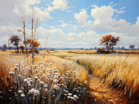 A painting of an open space with grass in the background