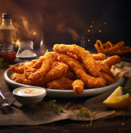 chicken finger food breast crispy meat nugget top plate view crunchy meal dish sauce snack table homemade white cooked brown delicious bbq background dinner fast wooden fastfood lunch above golden appetizer ketchup fresh tomato diet cuisine grilled roasted fried poultry breaded rustic american strips nuggets tasty portion eatImagine Buddy