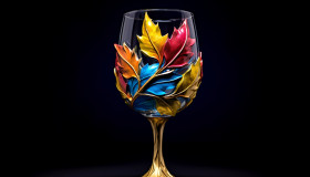 Colorful wine glass with gold and leaves, carnival glass style art
