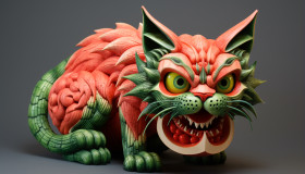 A cat made of watermelon with its jaws open, carving styles art