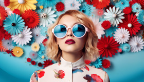 Woman wearing colorful sunglasses in front of floral pattern, collage style art