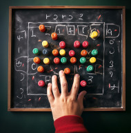 A close up shot of a teachers hands writing on a chalkboard