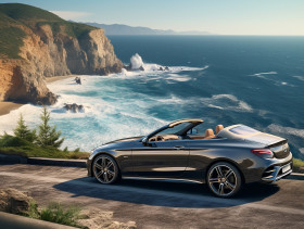 A car is parked on a cliff overlooking the ocean