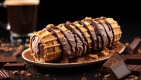 A photo of a chocolate ice cream with nuts and wafer rolls on the stylish glass