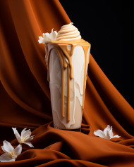 A photo of a caramel milkshake, beverage advertisement photography inspiration