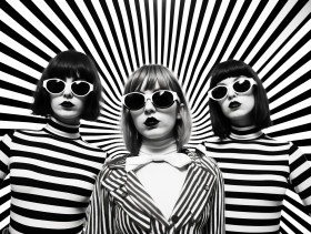 Three women in black and white striped outfits