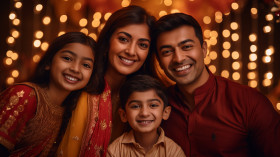 A family dressed up in their best clothes for diwali, taking a picture together, family diwali celebration image