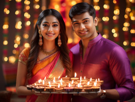 A young indian couple wearing traditional diwali clothes, standing in front of a brightly lit oil lamp, family diwali celebration image