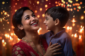 A picture of an indian mom and her son celebrating the festival of diwali, family diwali celebration image
