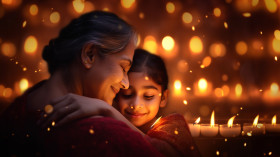 A mom and her daughter are hugging each other very closely, family diwali celebration image