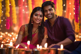 A picture of a young indian couple sitting close together during diwali, family diwali celebration image