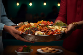 A picture of two people in love holding a plate for hindu prayer, family diwali celebration image