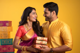 indian woman sari hindu male gift box yellow studio background happy couple love romance celebration festival diwali wedding engagement anniversary gift giving unwrapping present surprise excited joyful smiling happy faces studio photography portrait fashion culture tradition diversity inclusion representation lifestyle love story relationship goals togetherness forever happily ever afterImagine Buddy