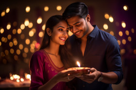 indian young couple holding diya diwali night indoors photo celebration festival tradition culture love romance happiness joy light hope faith family home indoors celebration ritual ceremony tradition culture religion faith love romance happiness joy light hope faith family home indoor celebration ritualImagine Buddy