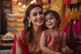 mother daughter traditional attire indian festival namaste smile camera look occasion festival happy family love bond relationship culture tradition heritage ethnicity religion faith belief spirituality meditation yoga peace harmony unity togetherness joy happiness celebration celebration devotion culture heritage colors vibrant happiness love familyImagine Buddy