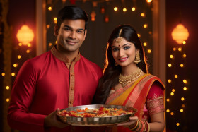 couple married traditional wear puja thali diwali festival portrait love happiness joy spirituality religion culture heritage celebration light knowledge prosperity wealth lakshmi ganesha saraswati kubera dhanvantari vishwakarma yamaraja shani navagraha diya rangoli crackers sweets gifts family friends community celebration togetherness love happiness joy spirituality religion culture heritage traditionImagine Buddy