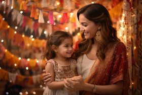 A picture of a mother and daughter dressed in traditional indian clothes for a festival, family diwali celebration image