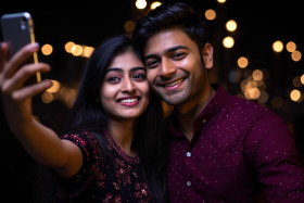 diwali couple selfie smartphone festival india young indian black background bokeh lighting series portrait photo happy celebration deepavali love romantic happiness joy smile light colors traditional culture ethnic celebration holiday happiness laughter togetherness family friends fun festive vibrant colorful cheerfulImagine Buddy