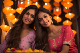 A picture of two young indian women celebrating diwali, the festival of lights, family diwali celebration image