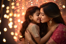 diwali celebration festival joy bond affection care warmth support unity diversity culture religion tradition festival celebration joy togetherness bond affection care warmth love happiness family mother daughter hug embrace smile laughter portrait photo woman girl indian traditional attire dress diwali lights rangoli flowers diyas candlesImagine Buddy