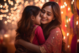 diwali celebration festival joy bond affection care warmth support unity diversity culture religion tradition festival celebration joy togetherness bond affection care warmth love happiness family mother daughter hug embrace smile laughter portrait photo woman girl indian traditional attire dress diwali lights rangoli flowers diyas candlesImagine Buddy