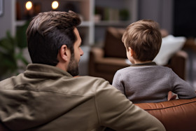 A photo of a father sitting on a couch with his preschool son talking and sharing their thoughts or problems the loving father is speaking to his little boy child and supporting him showing care and understanding, indoor activities for kids
