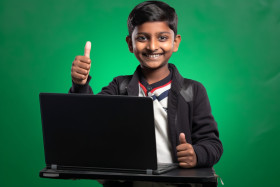 indian kid laptop green screen thumbs up camera happy smiling young education technology learning online school student studying class virtual remote distance learning future coding programming gaming entertainment social media communication work business startup freelancer entrepreneur digital nomad remote worker work from home work-life balance success opportunity growth development potentiaImagine Buddy