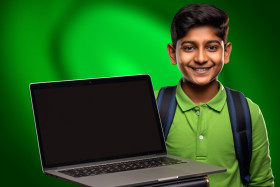 A picture of a young indian boy holding a laptop with a blank green screen and giving a thumbs up to the camera, kids indoor activities