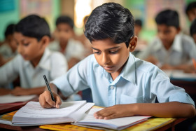 indian schoolgirl student sitting desk classroom writing notebook pencil examination test female education concept happy learning studying exam preparation focus concentration intelligent bright success achievement knowledge wisdom future hope opportunity development empowerment equalityImagine Buddy