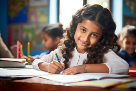 A photo of a young hispanic indian girl sitting at a school desk studying and doing homewor, kids indoor activities