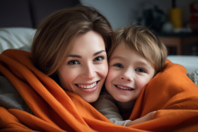 A picture of a mother and her son cuddling under an orange blanket on their bed at home, kids indoor activities