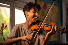 A photo of a happy indian teenage boy playing the violin in his cozy bedroom, lifestyle children indoors activitie