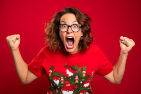 family couple funny crazy happy excited joyful victorious celebrating raising fists screaming yes christmas tree design pullover jeans costume two people wife husband brown hair portrait photo holiday celebration winter family fun family love togetherness happiness celebration of life joy excitement victory cheer happiness laughter fun festive holiday spirit loveImagine Buddy