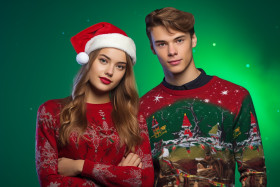 A photo of two young people in fashionable christmas clothes on a colored background, christmas festival people image