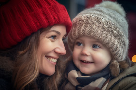 toddler girl mother christmas market holiday winter family love happy joy smile winter wonderland festive cheerful merry bright sparkling twinkling ornaments lights decorations tree gifts shopping stalls vendors food drinks carousel santa claus elves reindeer snow ice mittens hat scarf coat boots laughter fun memories togethernessImagine Buddy