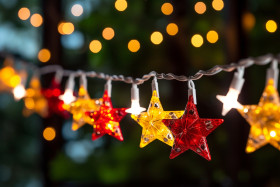 A photo of christmas star lights hanging on fir branches with a blurry background, christmas festival celebration images