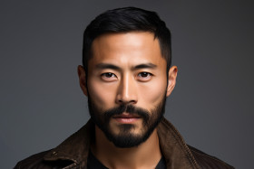 Picture of a serious confident young asian man with a black beard he is standing in front of a blank background and looking at the camera, personal grooming man photo