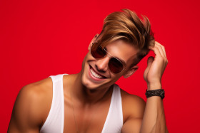 handsome young cheerful man sunglasses hair smile camera red background portrait model fashion style lifestyle summer happy positive joyful confident attractive charming good looking stylish trendy cool urban hipster casual urban studio indoor outdoor headshot portraiture photography photo image picture visualImagine Buddy