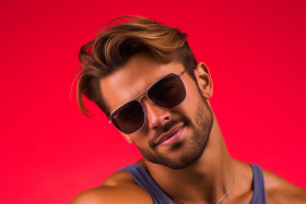 handsome young cheerful man sunglasses hair smile camera red background portrait model fashion style lifestyle summer happy positive joyful confident attractive charming good looking stylish trendy cool urban hipster casual urban studio indoor outdoor headshot portraiture photography photo image picture visualImagine Buddy