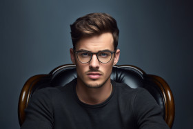 handsome young man glasses chair leaning looking camera isolated grey photo portrait studio fashion style lifestyle modern professional businessman entrepreneur creative intelligent confident attractive stylish trendy cool minimalist monochrome neutral business portraiture male head face expression pose poseable model photographyImagine Buddy