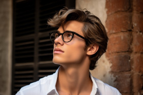 A picture of a handsome young man in casual clothes fixing his glasses and looking away from the camera while standing in front of a brick wall, personal grooming man image