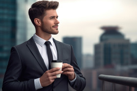 A picture of a young man wearing a suit and holding a coffee cup he is standing outside and looking away from the camera there is a city in the background, personal grooming man photo