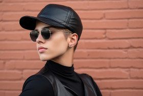 Picture of a cool young man in a black hat leaning against a wall and looking away, personal grooming man image