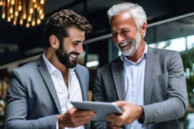 A picture of a happy young man and older man talking nicely about something while looking at a computer tablet together, business and corporate inside office image