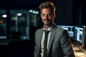 A photo of a young businessman smiling while standing alone in a dark office late at night, business and corporate inside office photo