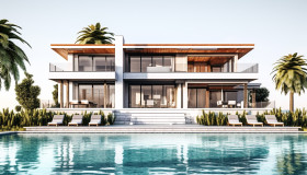 A photo of a luxury house with swimming pool isolated on empty white background in property investment, architecture stock photo