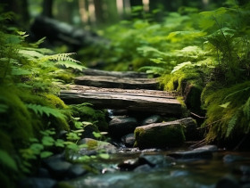 A wooden bridge spanning over a clear stream in the forest, natu