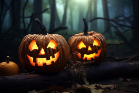 A picture of halloween pumpkins on a wooden table in a dark and scary forest at night, halloween party image