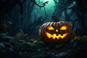 Picture of a carved pumpkin in a spooky forest at nighttime, halloween party image