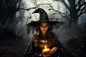 A picture of a young woman dressed as a witch for halloween, holding a book of spells and casting a spell in a dark forest, halloween party image